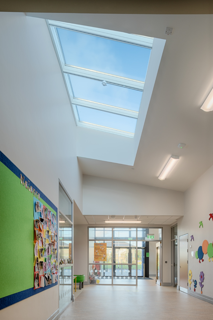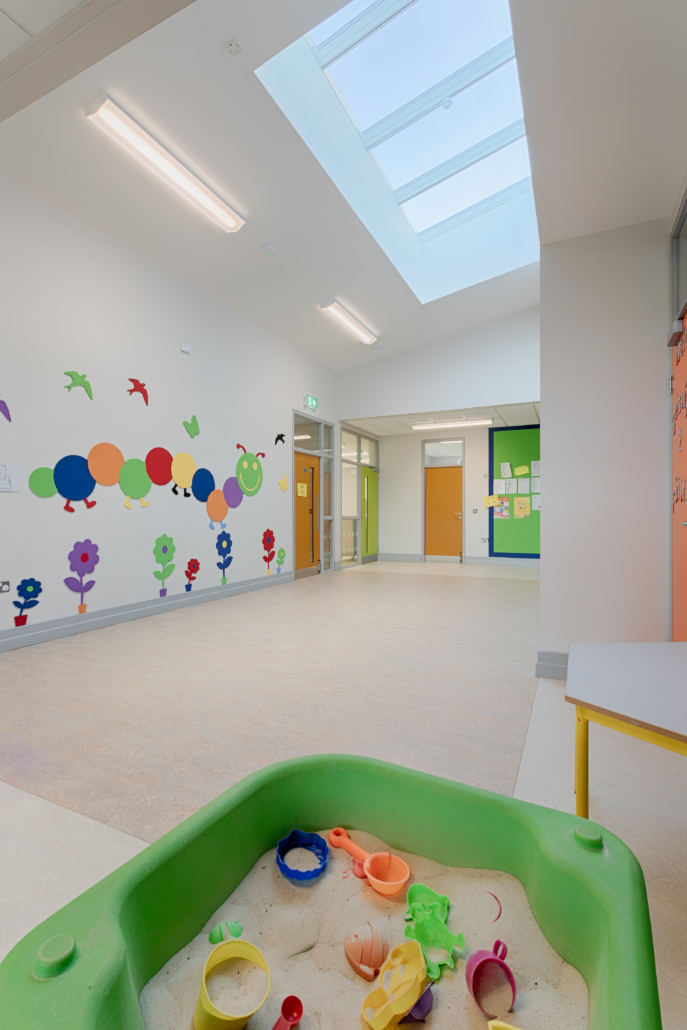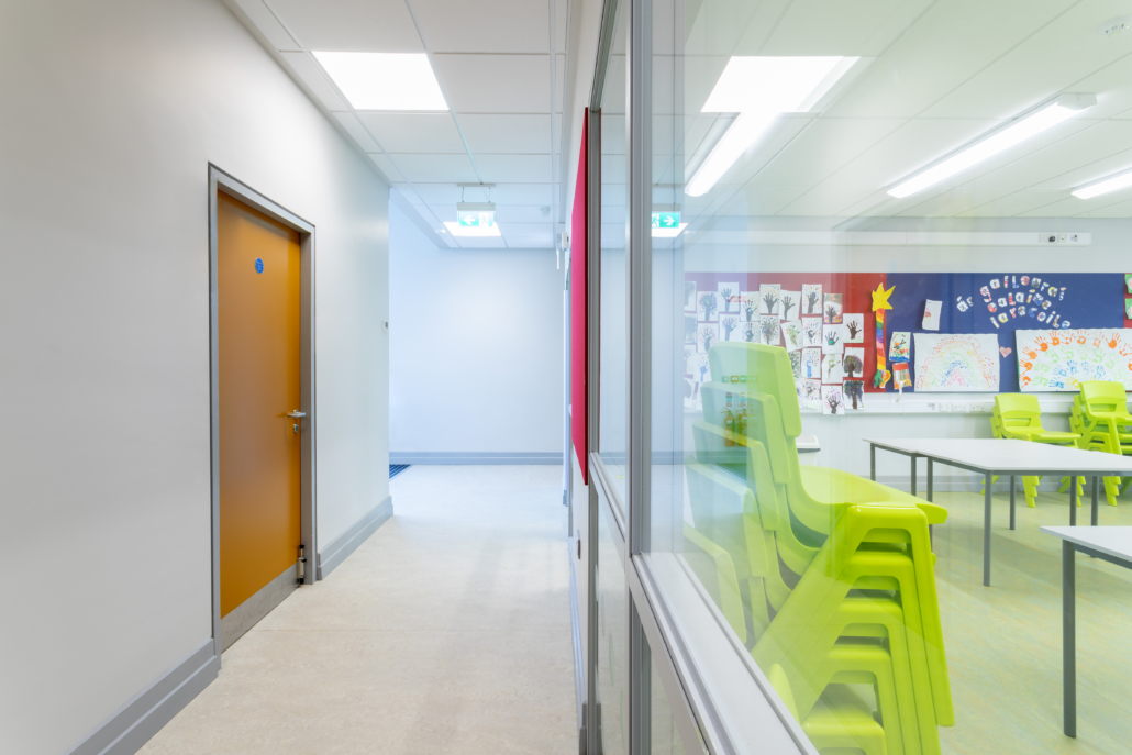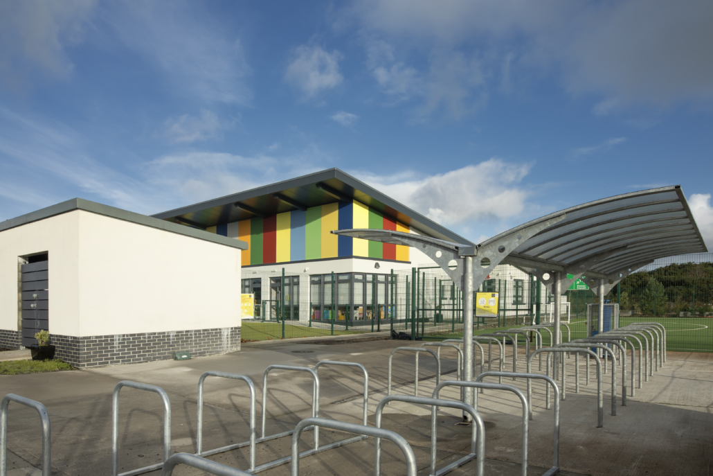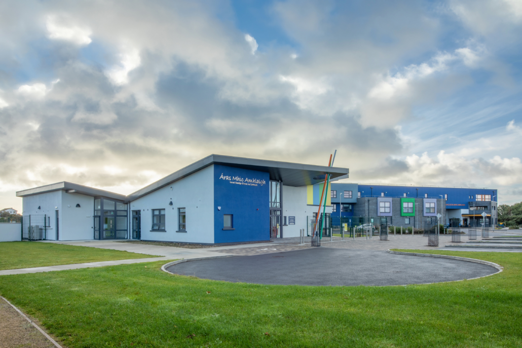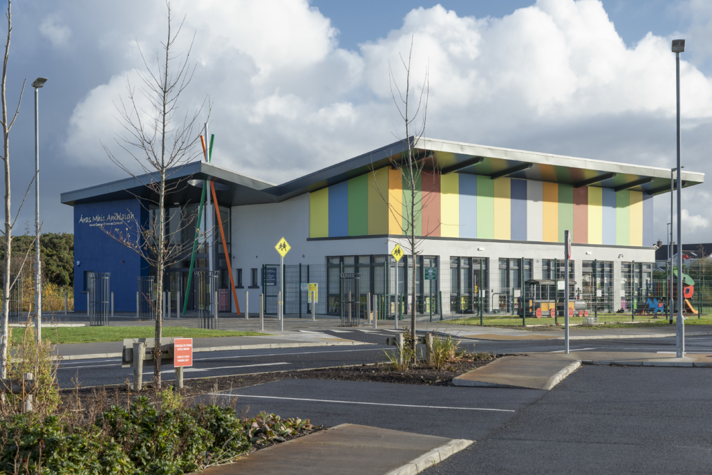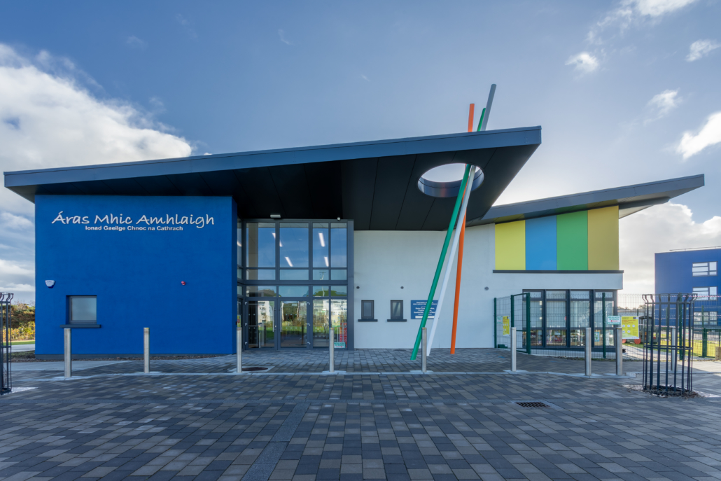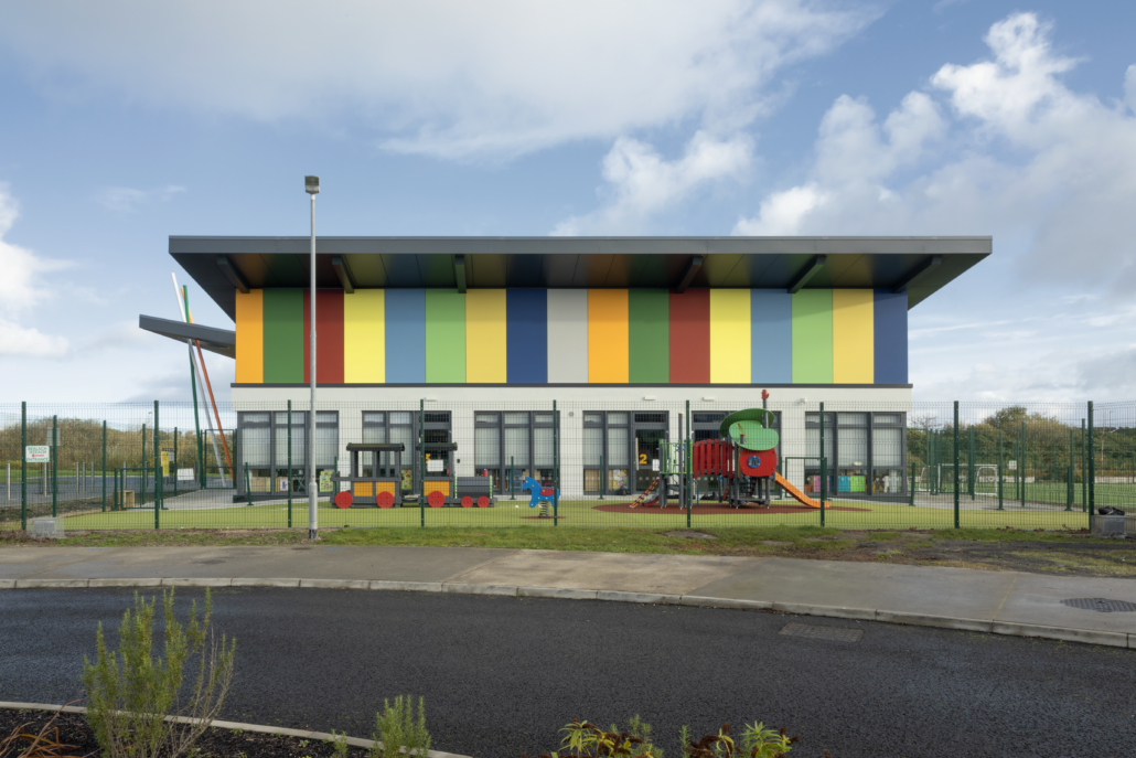This project involved the construction of a new 550 sq. m. state of the art educational facility and all associated site works. Works included the construction of a bespoke steel superstructure, colourful architectural cladding & panelling, complex multi angular roof structure with a combination of complementing finishes. The internal design maximised the light for both teaching & circulation spaces by using roof lights and high-level glazing. The internal finishes match the colourful exterior to provide a vibrant teaching environment for staff and students.